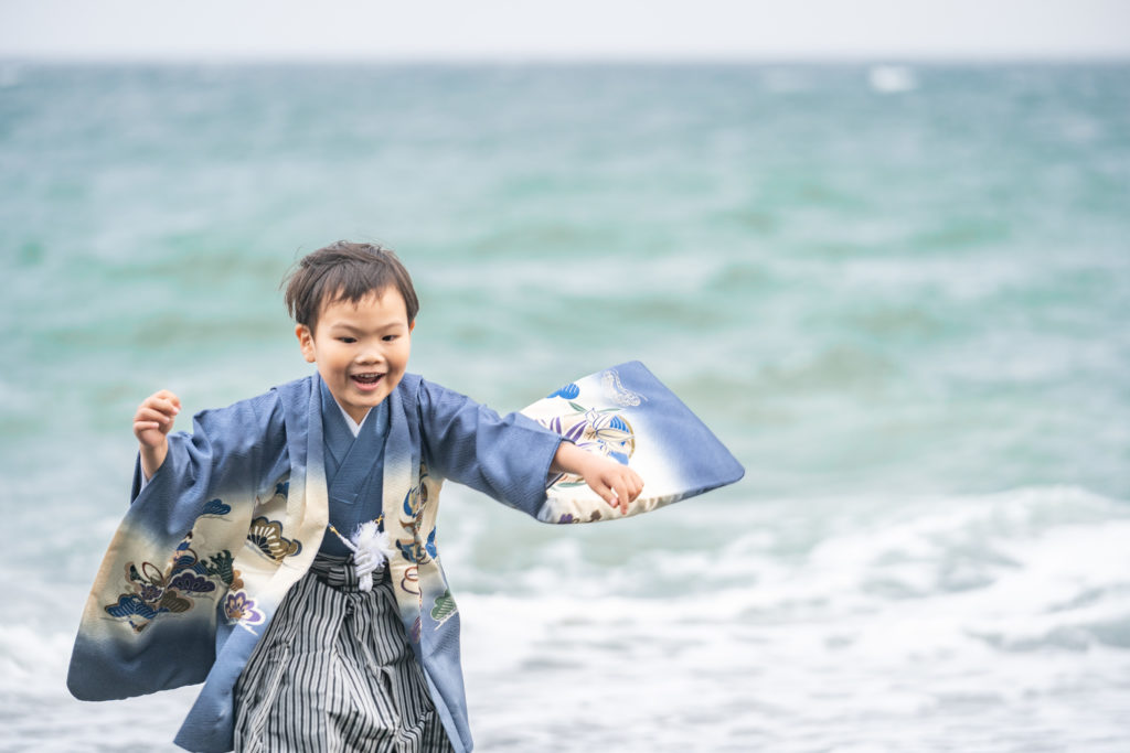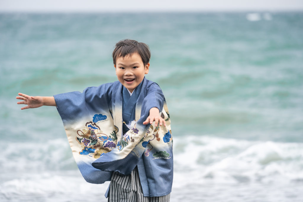 七五三のフォーマルなスタジオ撮影だけでなく、海辺でのナチュラルなロケ撮影も追加料金無しで可能です。